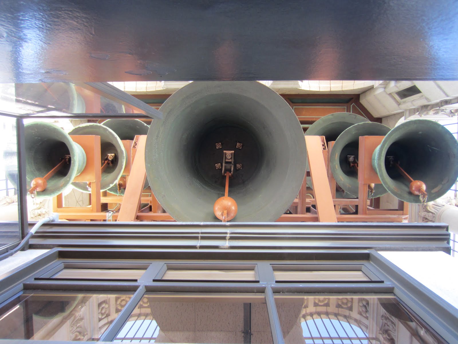 Наверху первым делом обращаешь внимание на висящие под потолком колокола самых разных размеров (их всего 61). Колокола не просто звонят, а исполняют музыку.