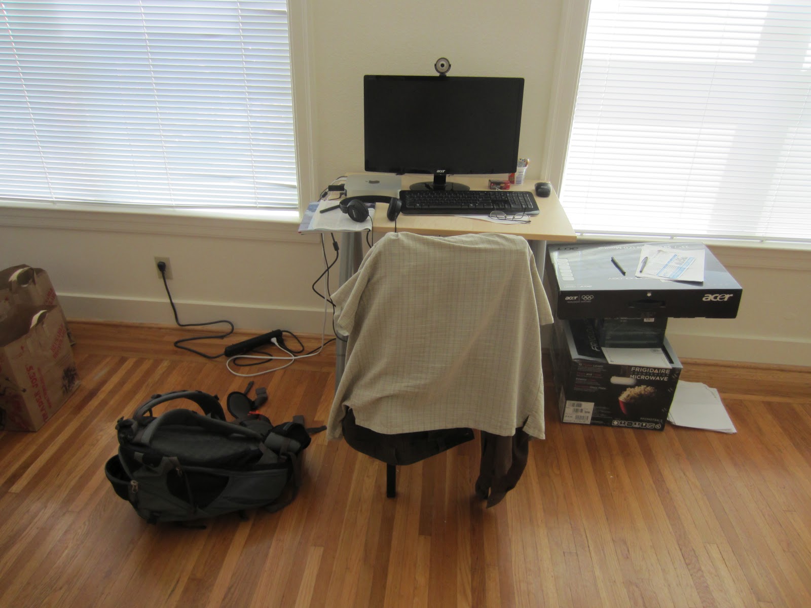 Наконец, между окнами находится центр моей маленькой вселенной: компьютер на столе, стул за столом и кое-что из одежды на стуле. Если я дома и бодрствую, то здесь я обитаю 90% времени. Жалюзи на окнах всегда закрыты.