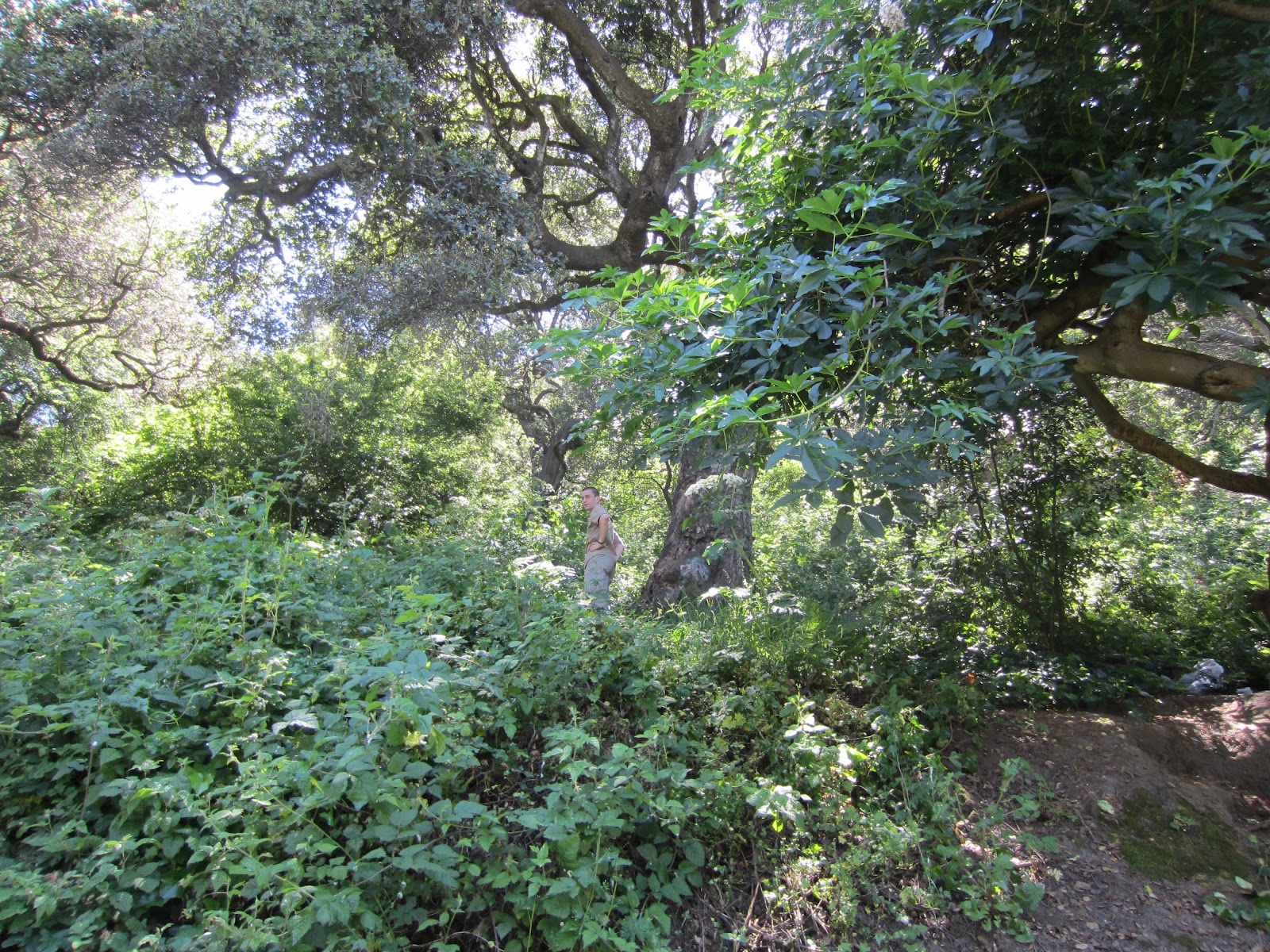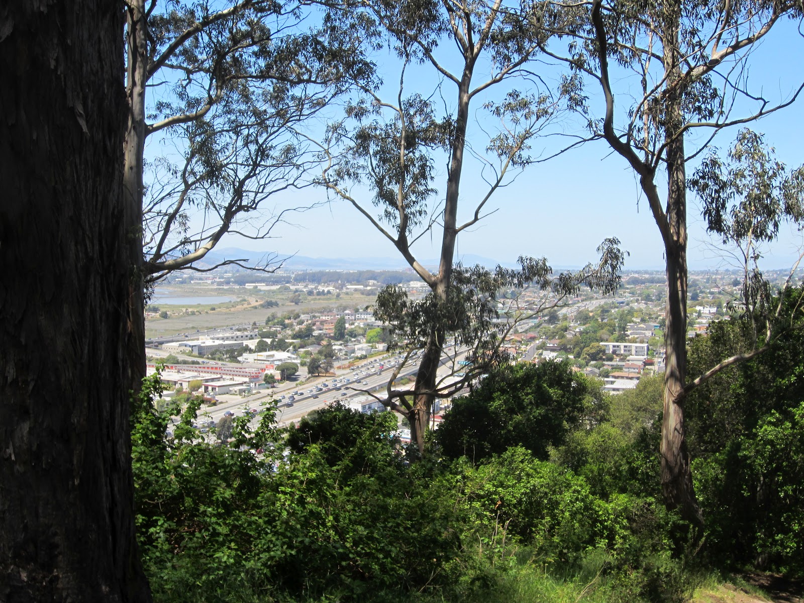 Тропа обнаружилась с северной стороны, где уже начинался следующий город Эль Серрито. Мы пересекли мелкий ручей и поднялись на макушку холма, где двое пейнтболистов, расстреливали краской мишень. Из-за деревьев виды с вершины открываются очень ограниченные. Кусок города, кусок шоссе.