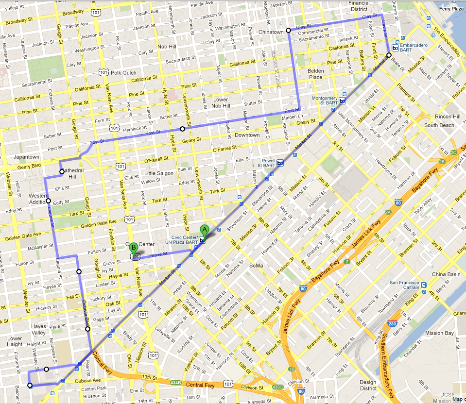 В результате из дома вышли без двадцати четыре, а на станцию Civic Center приехали полпятого. Последующие три часа провели в бесцельных блужданиях вокруг да около, до Даунтауна и обратно. Я не смогу нарисовать точной карты нашего маршрута, но в общих чертах мы бродили по этому региону.