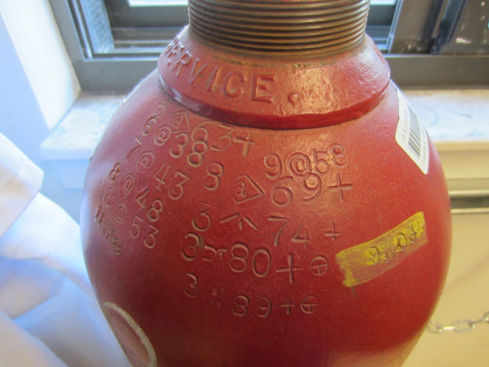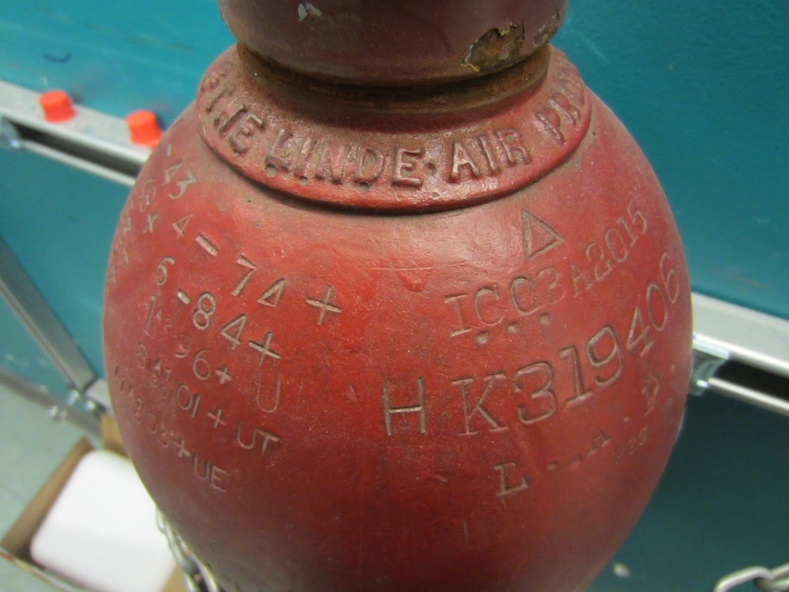 Если цифры, отчеканенные сбоку – даты регулярных проверок, то баллону почти сто лет.