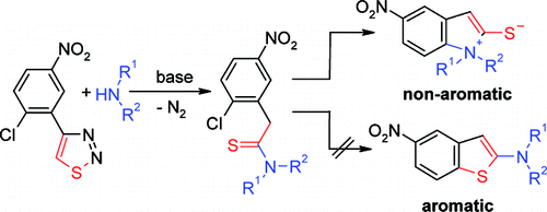 Androsov, D. A. Synthesis of 1,1-Dialkylindolium-2-thiolates via Base-Induced Transformation of 4-(2-Chloro-5-nitrophenyl)-1,2,3-thiadiazole in the Presence of Secondary Amines. J. Org. Chem. 2008, 73, 8612-8614.