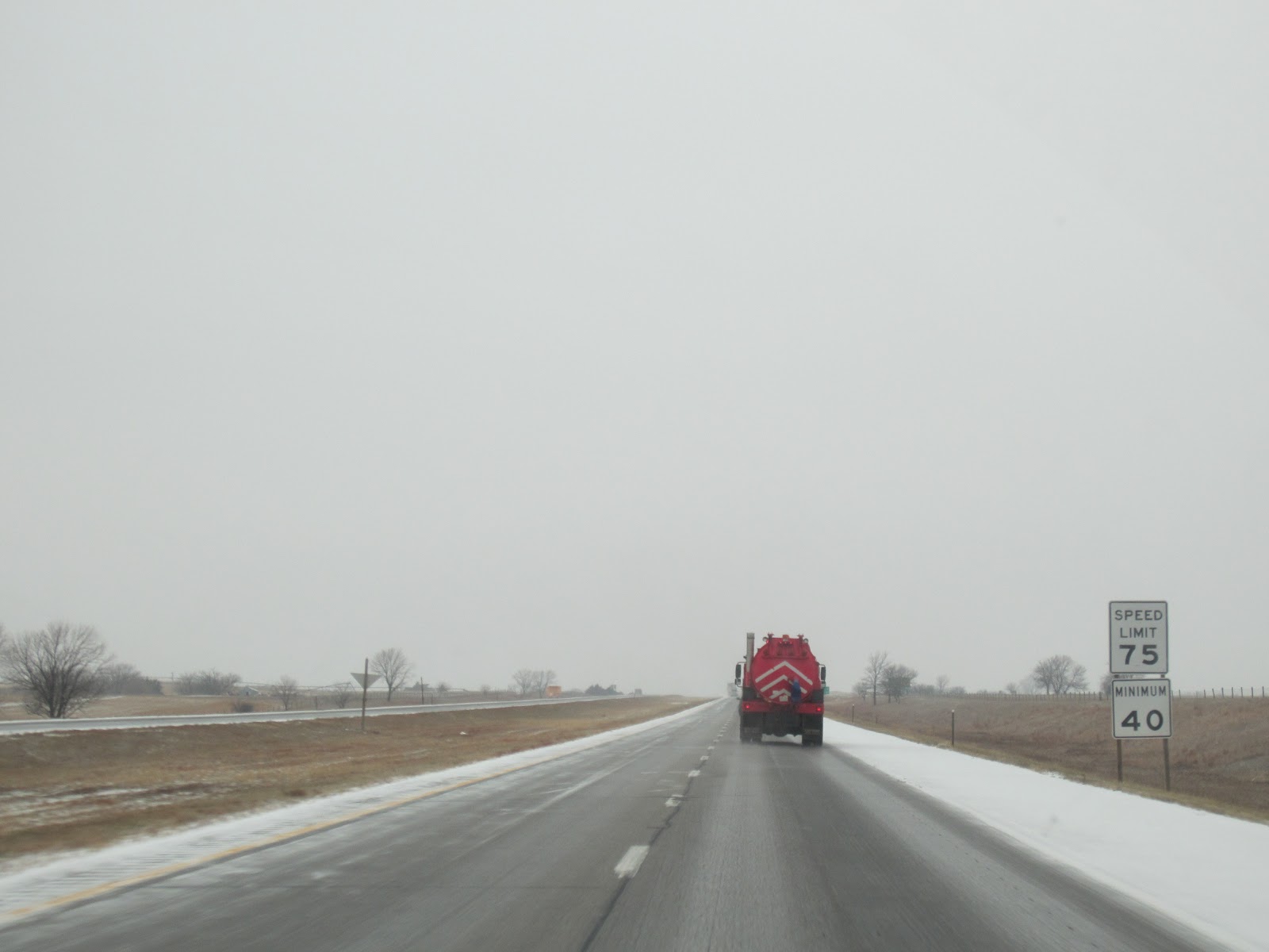 Но стоило нам двинуться в путь, как стало чуть интереснее. Дорогу припорошило небольшим снежком, и водители дружно испугались ехать разрешенные 75 миль в час и покорно тянулись гуськом с гораздо меньшими скоростями.