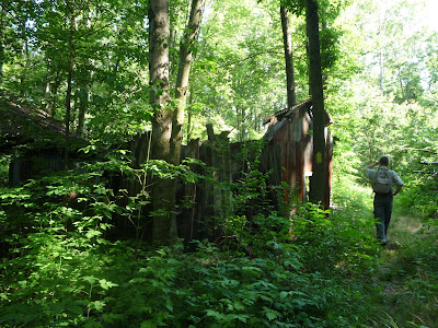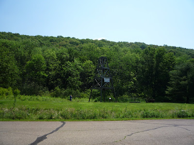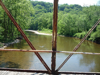 Сама по себе тропа была неизмеримо легче, чем на Slippery Rock Gorge Trail'е. Были, конечно, пара долгих спусков-подъемов, но общий рельеф настолько прост, что не идет в сравнения с прыжками по камням. Так что абсолютно чистым эксперимент признать нельзя: трасса другая, да и мы другие, уже натренированные. Шли мы против часовой стрелки. Восточный участок туда чаще и дальше отходил от ручья, петлял и потому оказался длиннее западного. До моста рядом с Miller Farm мы добрались за три часа (в 14.40). Развлечения по пути составляли: наблюдательная площадка на шесть сохраненных остовов вышек и железнодорожный мост;